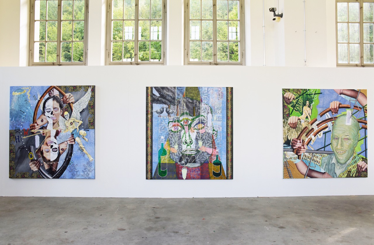 In den nicht eindeutig definierbaren, mit Tapeten gestalteten Bildräumen treten verschiedene Figuren und Gesichter, Augen und Lippen, teils gemalt, teils ausgeschnitten, in den Vordergrund und stehen in direktem Bezug zu den Künstlern selbst. Es handelt sich um eine Form von Künstlerporträt, bei dem sich die eigene und fremde Sicht im kollektiven Arbeiten übereinanderlegt und das Vielgestaltige des Individuums andeutet. Hände, die eine Art Steuer umfassen, gefüllte Gläser, goldener Rauch sind Fragmente, die an Alltägliches erinnern. In einem fantastischen Umfeld neu kontextualisiert öffnen sie den Blick in eine Welt des Rausches und vermitteln ein anderes Zeitgefühl, in dem auch die Nähe zum Tod anklingt. Diese Zeitvergessenheit wird in der farblich-ästhetischen Umsetzung erfahrbar.