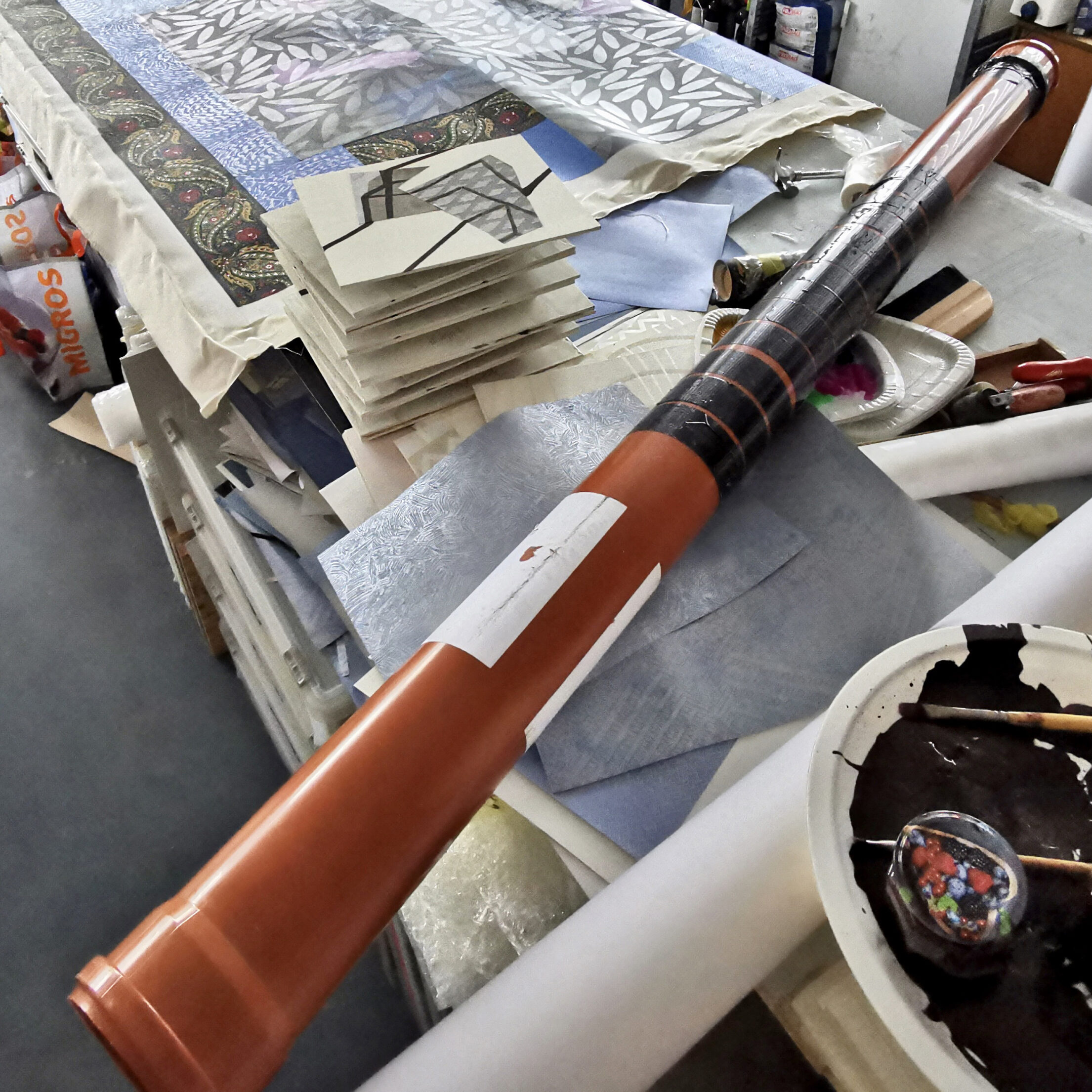 Das Format ist die einzige Vorgabe für die bildnerische Gestaltung der mit Gesso grundierten Baumwolltücher. Es besteht keine Thematik, an die man sich halten muss. Ebenso ist die Technik der Ausführung offen und nicht eingegrenzt. Im kreativen Prozess des Gestaltens ist also alles erlaubt. Da wir uns in sehr unterschiedlichen Bereichen im jeweils eigenständigen, künstlerischen Schaffen betätigen, ist diese Freiheit bei der Wahl der Technik und der gestalterischen Mittel bewusst offengelassen und auch er-wünscht. Im Verlauf des Arbeitens über die drei Bildformate und die drei sehr unterschiedlichen ersten Ansätze kann sich durchaus eine gemeinsame Thematik entwickeln. Dies ist aber keine Bedingung und auch nicht das Ziel der Gemeinschaftsarbeit unseres Künstlerkollektivs. Mit jedem gestalterischen Eingriff jedes Künstlers auf jedem der drei Bildformate eröffnen sich immer wieder neue Sichtweisen, Ideen und Perspektiven.